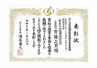 | この度、令和2年度埼玉県企業局優秀委託業務表彰奨励賞を受賞いたしました。 本件は、産業団地整備における基礎資料を作成する目的とした業務で、業務遂行にあたり専門技術力における提案・改善力や、工程管理能力を高く評価されました。 |